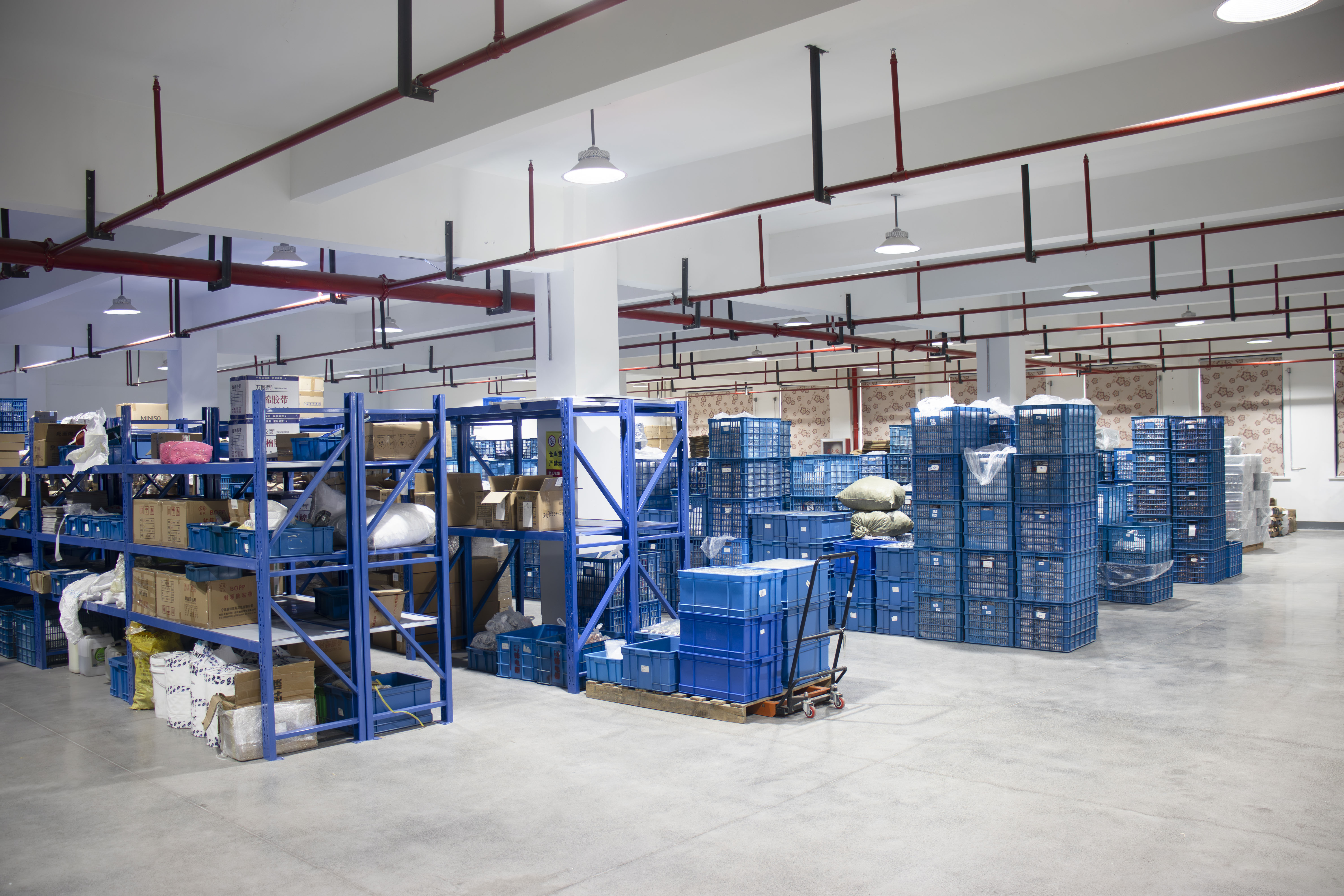 Verkstaden har ljusblå epoxigolv med gula avgränsningslinjer, tydligt definierande arbetsområden och materialkanaler. Komponenter kategoriseras i blå förvaringsfack, medan monteringsarbetsstationer är utrustade med skuggfri belysning och industriella ventilationssystem. Bakre flerskiktshyllor lagrar produktionsmaterial, synkroniserade med kontrollterminaler för att övervaka materialanvändning i realtid och minimera driftsstopp.